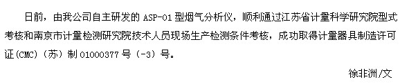 公司喜獲ASP-01型煙氣分析儀制造計(jì)量器具許可證