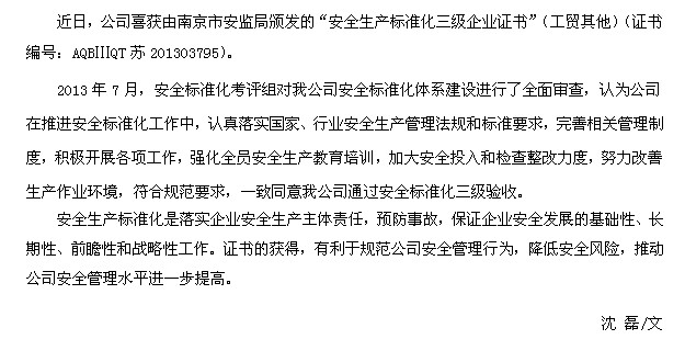 公司喜獲“安全生產標準化三級企業(yè)”證書