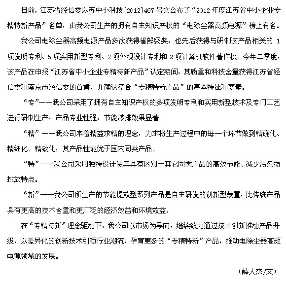我公司高頻電源榮膺“江蘇省中小企業(yè)專精特新產品”稱號