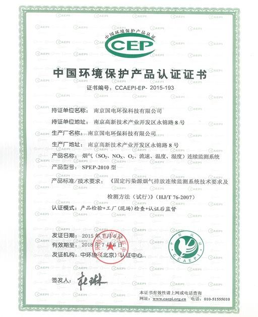 “SPEP-2010型煙氣排放連續(xù)監(jiān)測系統(tǒng)”獲得“中國環(huán)境保護(hù)產(chǎn)品認(rèn)證證書”