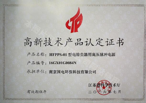 2016年7月,我公司自主研發(fā)的HFPPS-01型電除塵器用高壓脈沖電源通過江蘇省科學(xué)技術(shù)廳認定,并頒發(fā)高新技術(shù)產(chǎn)品認定證書。