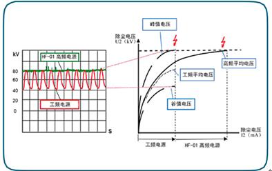 與工頻電源相比,高頻電源的供電電流由一系列窄脈沖構(gòu)成,其脈沖寬度、幅度及頻率均可以調(diào)整,根據(jù)不同工況提供最合適的電壓波形,提高除塵效率,控制方式靈活形。間歇供電時(shí),可有效抑制反電暈現(xiàn)象,特別適用于高比電阻粉塵工況。