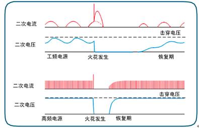 與工頻電源相比,高頻電源脈沖時(shí)間極短,火花控制性能好,僅需很短的時(shí)間(<25μs,而工頻電源需要10000μs)即可檢測(cè)到火花發(fā)生并且立刻關(guān)閉供電脈沖,因而火花能量損失很小,電場(chǎng)恢復(fù)快(僅需工頻電源恢復(fù)時(shí)間的20%),從而進(jìn)一步提高了電場(chǎng)的平均電壓,提高了除塵效率。