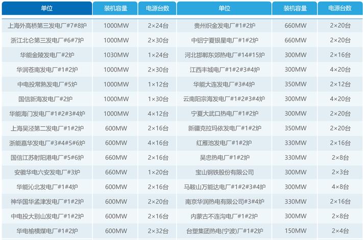 HF系列高頻電源已經(jīng)擁有6000余套設(shè)備全國(guó)500余臺(tái)機(jī)組的運(yùn)行業(yè)績(jī),其中1000MW級(jí)機(jī)組有30余臺(tái),600MW級(jí)機(jī)組100余臺(tái),300MW級(jí)機(jī)組200余臺(tái),濕式除塵器配套100余臺(tái),運(yùn)行穩(wěn)定可靠,減排與節(jié)能效果顯著。