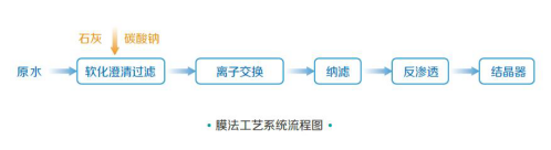 膜法工藝采用化學(xué)軟化和樹(shù)脂軟化后,將廢水通過(guò)納濾膜截留硫酸鈉,氯化鈉采用反滲透進(jìn)一步濃縮,濃縮液進(jìn)入結(jié)晶器制備高品質(zhì)氯化鈉。納濾濃水回預(yù)處理系統(tǒng)。