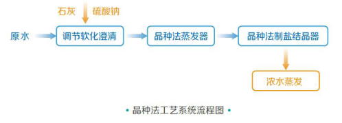 晶種法工藝采用調(diào)節(jié)軟化,即系統(tǒng)并不投加碳酸鈉去除鈣離子,后面也不需要過(guò)濾和離子交換,而是采用投加石灰和硫酸鈉兩種廉價(jià)藥劑,將廢水調(diào)整為氯化鈉和硫酸鈣兩種無(wú)機(jī)鹽溶液成分,澄清后直接進(jìn)入晶種法蒸發(fā)器,以防止硫酸鈣在蒸發(fā)器結(jié)垢。蒸發(fā)器濃水進(jìn)入晶種法制鹽結(jié)晶器,在結(jié)晶器內(nèi)將石膏晶種與氯化鈉分離,制備高純度氯化鈉,石膏晶種回預(yù)處理系統(tǒng)脫水。晶種法工藝運(yùn)行成本大幅降低,非常適合硬度較高、水量較大(10m3/h以上)的系統(tǒng)。