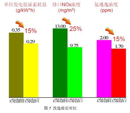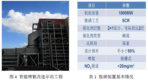 圖4為某電廠1000MW機組智能噴氨改造示范工程,脫硝裝置的基本情況見表1。為了評估智能噴氨改造的效果,分別對比了改造前后的流場分布、單位發(fā)電量尿素耗量、排口NOX濃度、氨逃逸、脫硝出口NOX不均勻度、氨氮摩爾比等。