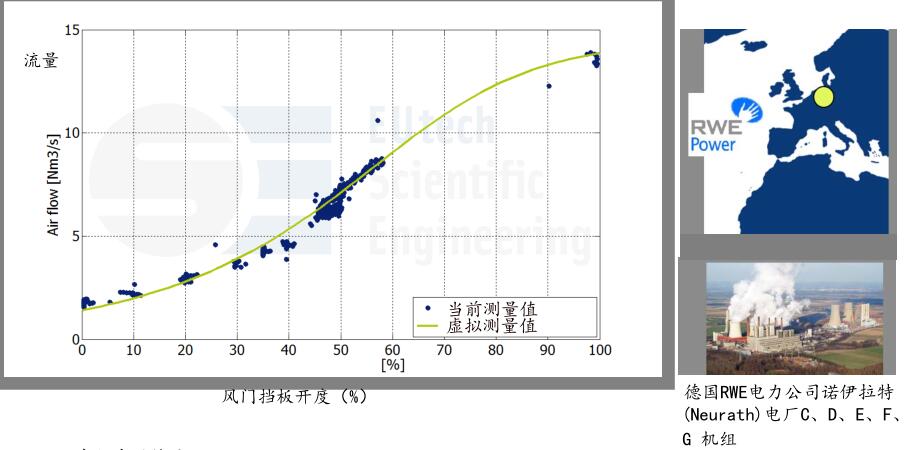 “風(fēng)量虛擬測量”已成功應(yīng)用在很多個燃煤火力發(fā)電廠。這些虛擬傳感器有助于發(fā)現(xiàn)并糾正調(diào)錯的風(fēng)量。能替換有缺陷的風(fēng)量測量裝置。與手工測量(如皮托管)結(jié)果相比,具有非常接近的效果。