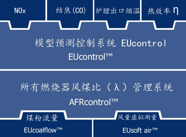 通過確定最佳運行參數(shù)的設定值,如擋板開度、給煤機轉(zhuǎn)速、分級風及氧量等,EUcontrol優(yōu)化控制軟件能提高風煤比管理系統(tǒng)的性能。通過連續(xù)在線的參數(shù)鑒別和再調(diào)節(jié),EUcontrol軟件作為多目標的實時優(yōu)化工具可進行智能控制和目標優(yōu)化,諸如提高燃燒效率、降低排放及降低結(jié)焦和積灰的趨勢等。